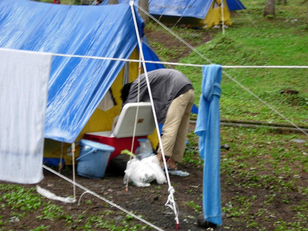遅刻者がいたため予定より若干送れて開校式がスタート。雨が降り始める前に大急ぎで準備をしようと言うことで、さっさと切り上げてテントなどの設営開始。