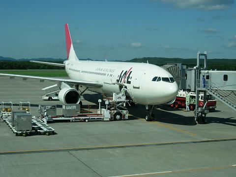 こちらは、釧路空港での撮影のもの。さすがに、釧路ではブリッジ経由。まぁ、ローカル空港だから設備は余ってるもんなぁ…。しかし、背景がのどかです。