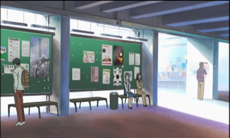 おー、、どっかで見たことあるアングル。。げんしけんとほぼ同じアングルを利用するとは。。 おなじみ生協前ですね。。学祭掲示板あたりか。
